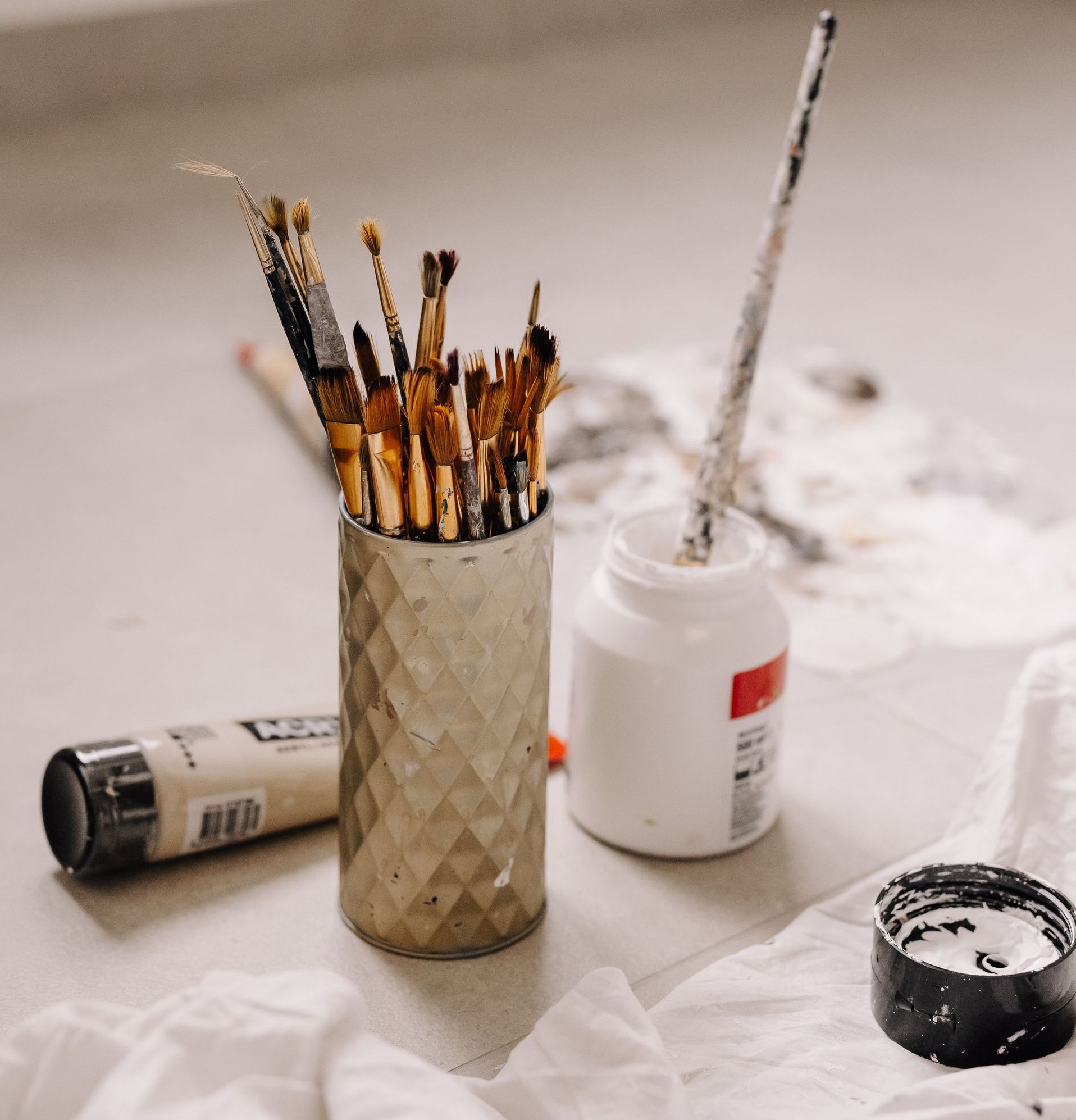 Meestal werk ik met penselen en mijn handen maar soms ook wel eens paletmessen, sponzen of andere atributen