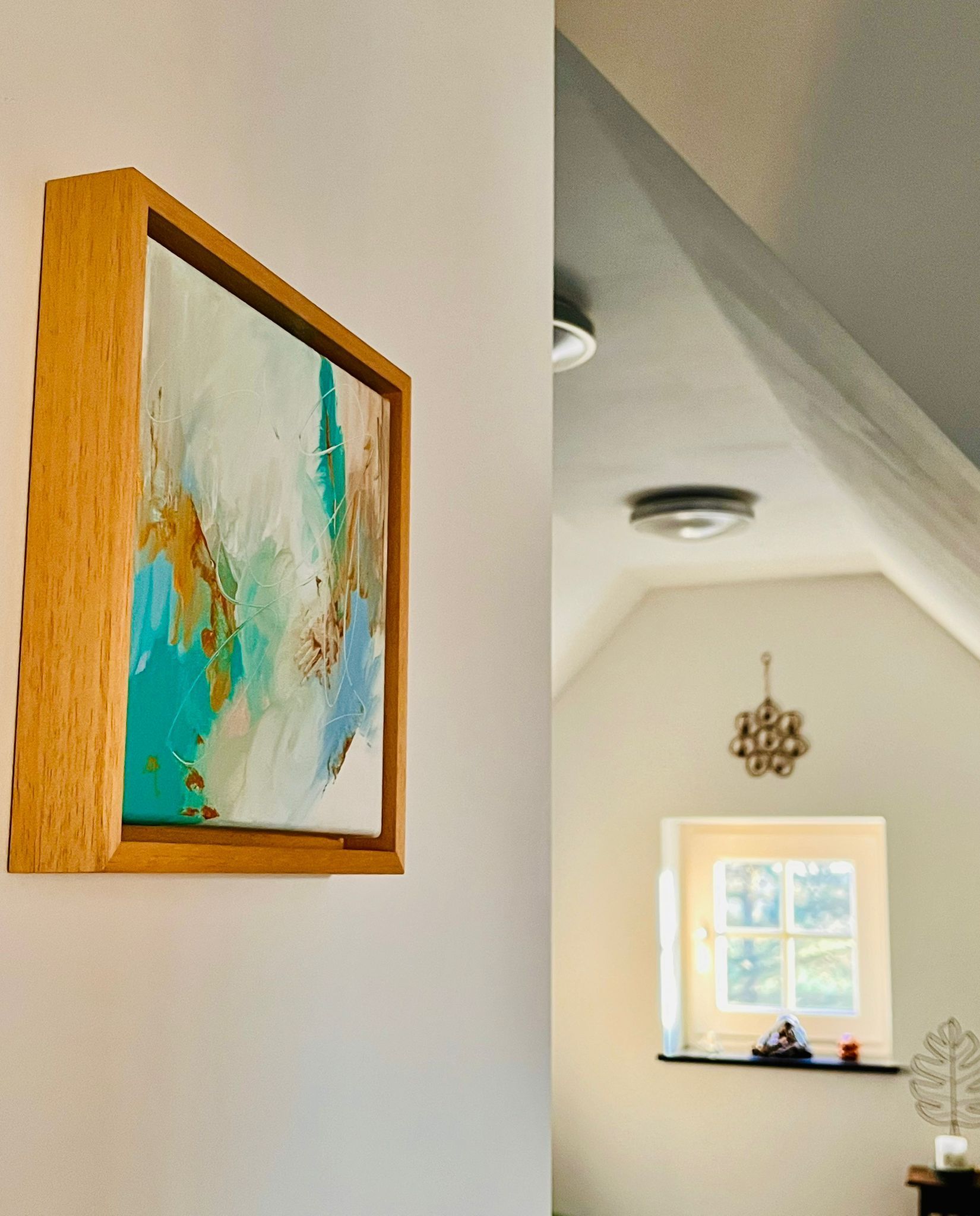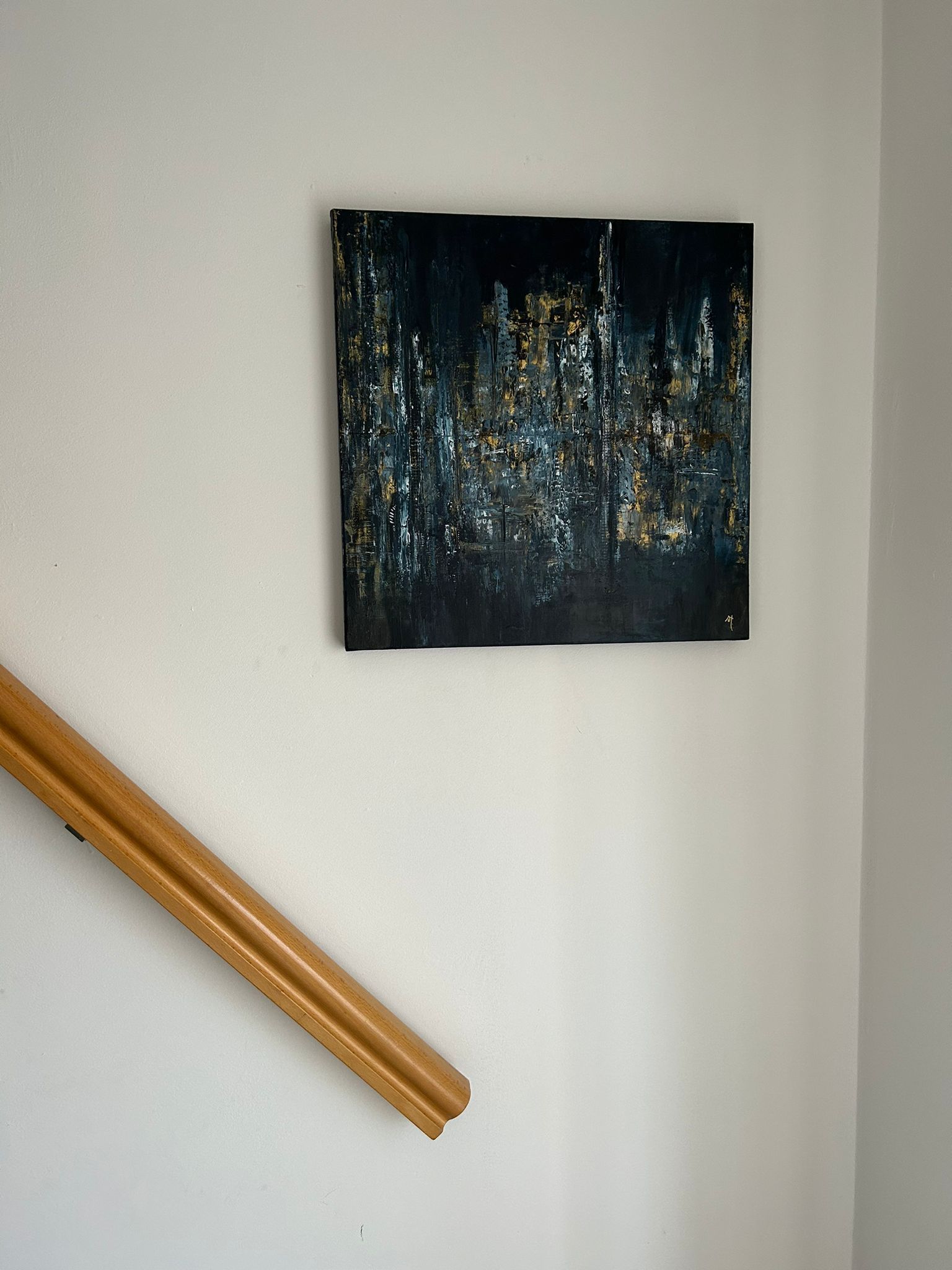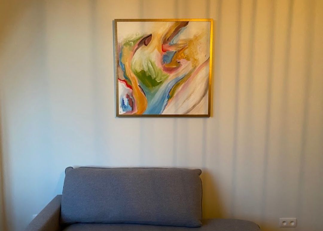 Ik zocht een cadeau voor onze huwelijksverjaardag. Omdat we pas verhuisd zijn vond ik een schilderij wel passen in ons interieur. Ik vond niks wat me aanstond tot ik op Sanne haar instagram zag dat zij schilderde. Gecontacteerd, snel thuis de muur opgemeten en samen bepaald welke grootte het beste zou passen. De basiskleuren mogen bepalen en de rest ons laten verassen. Ik kan zeggen zowel mijn vrouw als ik zijn superblij met het resultaat. Het past perfect in ons interieur en de kleuren zijn mooier dan we hadden durven dromen. In combinatie met de prachtige kader is het ons pronkstuk van de living. Echt geweldig!
